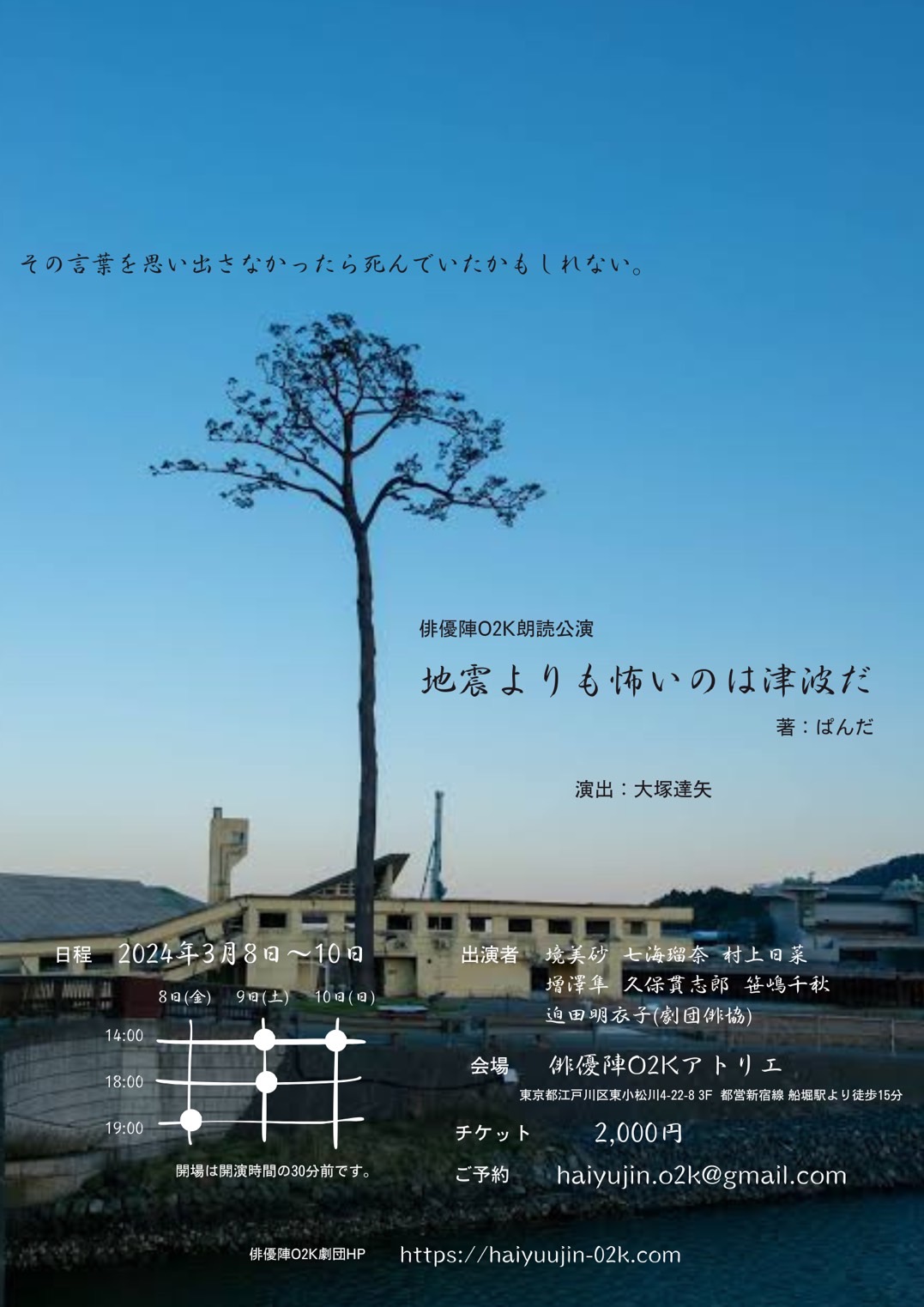 俳優陣O2K 朗読公演 【地震よりも怖いのは津波だ】作:ぱんだ 演出:大塚 達矢 2024.3.8~3.10 @俳優陣O2K アトリエ (都営新宿線「船堀」駅から徒歩12分) -Ticket- ¥2,000-(全席自由)