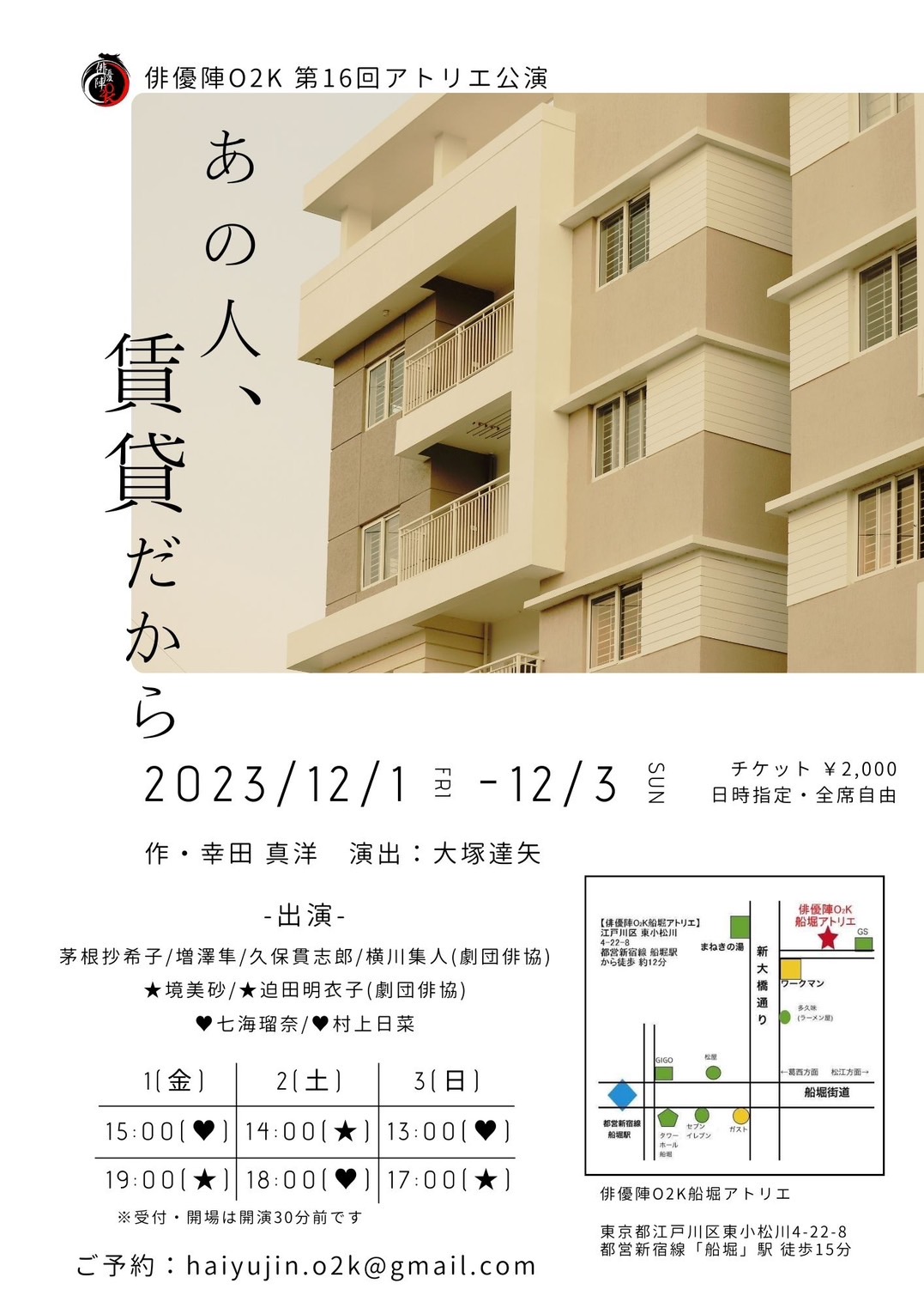 俳優陣O2K 第16回アトリエ公演 【あの人、賃貸だから】作:真田 真洋 演出:大塚 達矢 2023.12.1~12.3 @俳優陣O2K アトリエ (都営新宿線「船堀」駅から徒歩12分) -Ticket- ¥2,000-(全席自由)